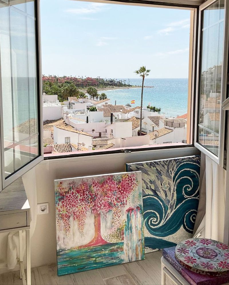 My main Art studio is located on the south coast of Spain and the view inspires me every day. I love to look out to sea, watching the fishing boats in the early morning and then occasional kite surfers during the day! Listening to the waves calms me and during the summer months the swift birds fly around and sometimes stop on my window seal to bask in the morning sun.